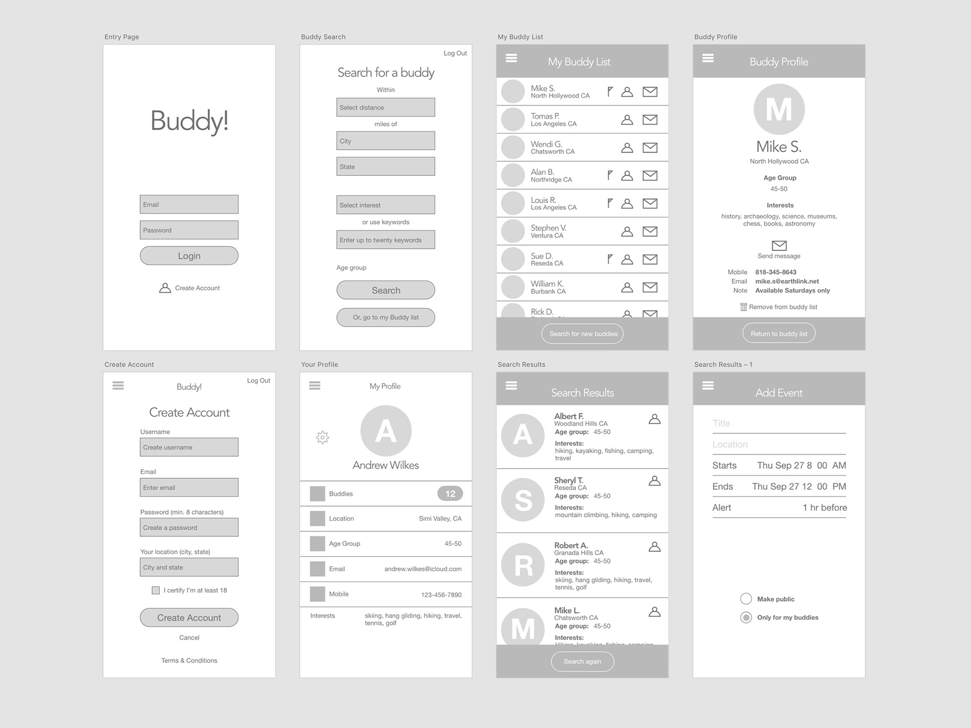 Sometimes it's not always easy to find friends or family members who share your interests. "Buddy!" is an app which allows people to connect with other people in their local area who share common interests or activities, whether it be sports, hobbies, outdoor activities, old movies, etc. Users can add events which show up as alerts on their list of buddies. A built-in messaging function allows everyone to connect and make plans. (Work in progress.)